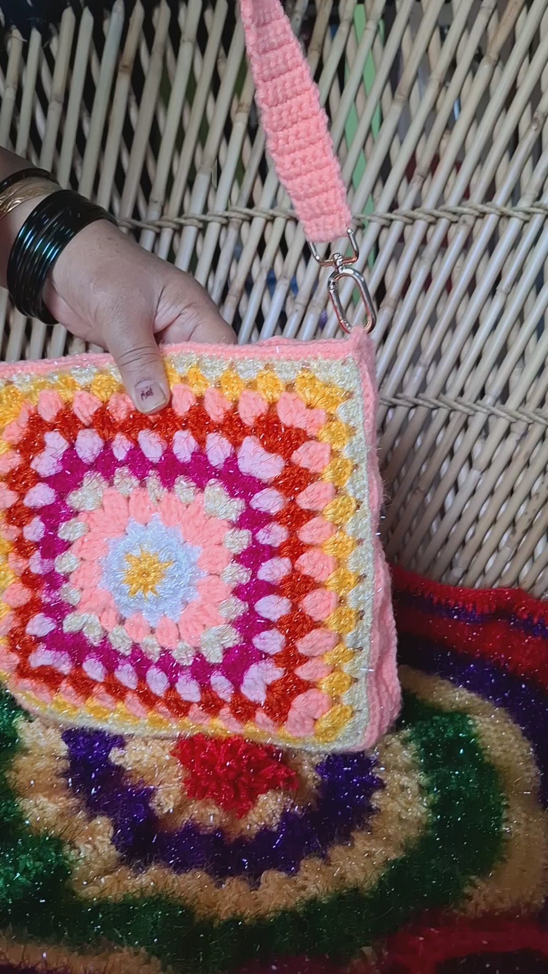 Bring a pop of sunshine to your everyday look with this colorful crochet sling bag. Featuring a vibrant granny square pattern in pink, orange, magenta, yellow, and white, this bag is perfect for casual outings, festivals, or gifting.
